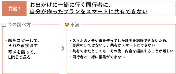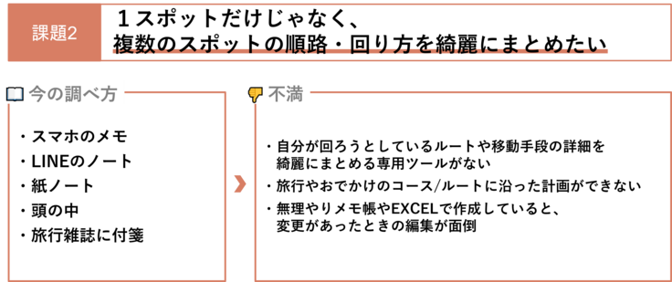 紙だと自由度は高いものの、付け足しや修正がやりづらい。メモ系アプリやスプレッドシートだとプラン作成用に作られていないので、視認性が悪かったり、一緒に行く人への共有が楽にできなかったり。専用アプリはそれらを解決しているものの、プランを練る上での思考の順路に沿った作りでないため、プランを計画するのに変に考えないといかず、UIUXがいいとは言えませんでした。もっと上手くて、簡単な方法があるんじゃないかとぼんやり思っていました。