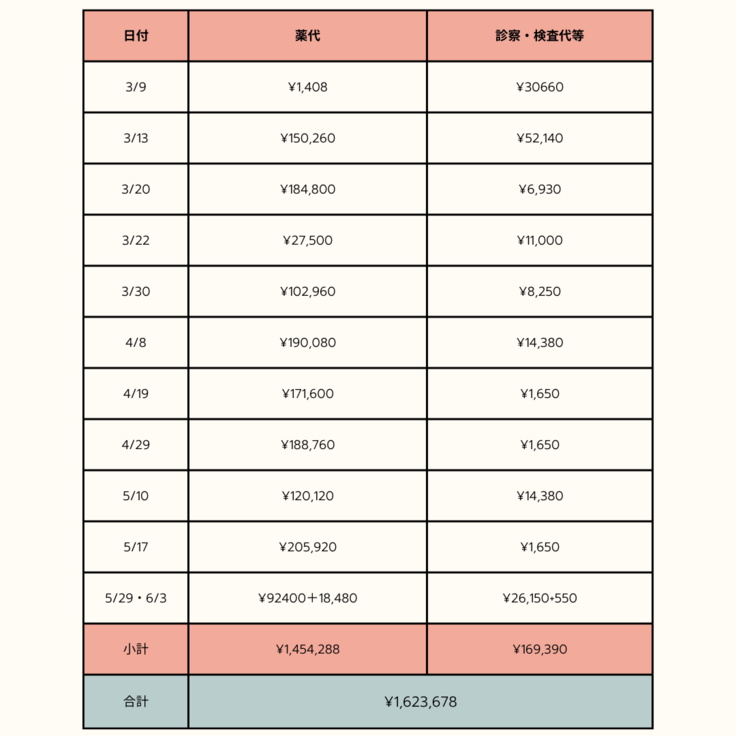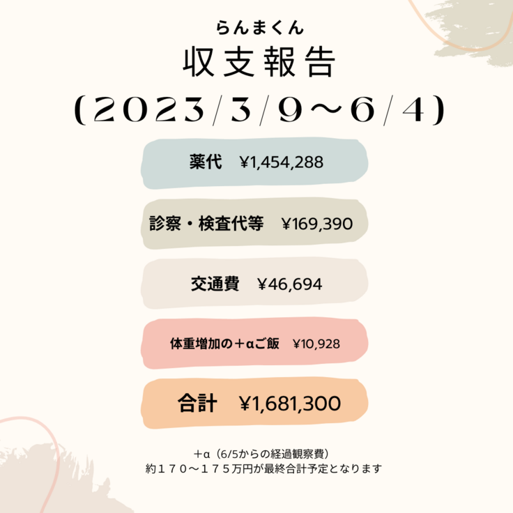 細かい領収書などはそれぞれ病院に行った日の新着情報をご参照ください💦