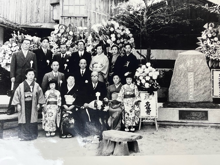 1955年11月3日江戸川乱歩生誕地碑除幕式の日に江戸川乱歩ご夫妻と発起人の皆様と一緒に撮った集合写真です。(私の祖父母もこの中にいます)