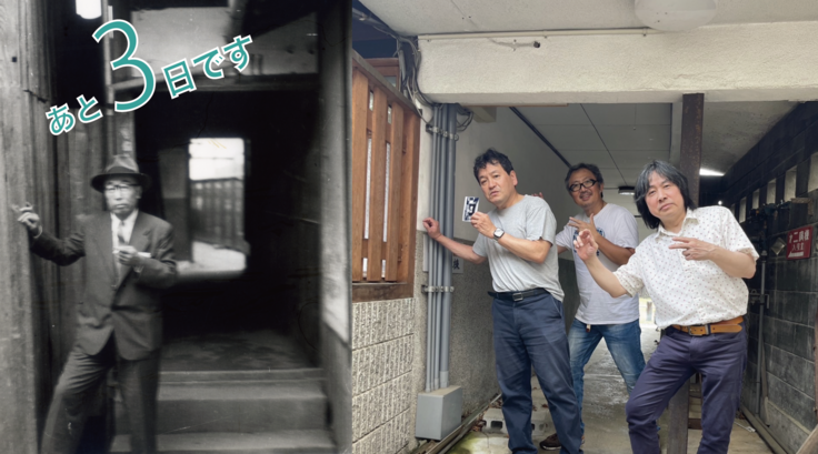 乱歩が生まれた借家があった場所で思わずポーズを決めてる3人でございます