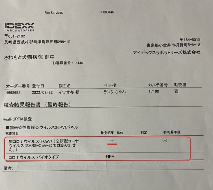 ランクは腹水が溜まっていたのでおそらくウエットタイプで、採取した腹水を検査に出し、FIPかどうか調べ、結果が1週間ほどで出るので電話で知らせてくれるとのことでした。