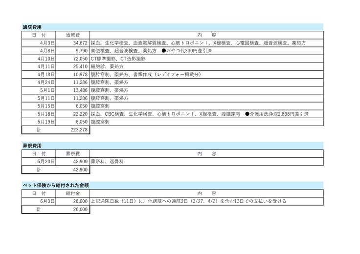 ラテの医療費と葬儀費、レディフォーでの支援額、保険給付金につきまして、以下の通りとなっています。