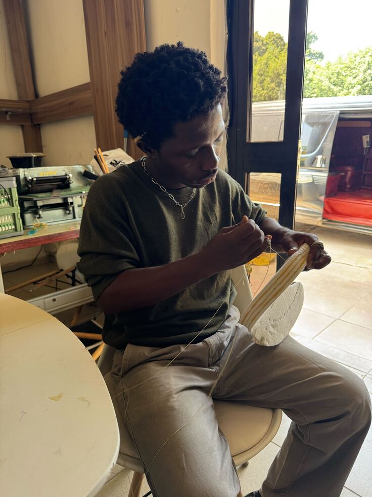 ナイジェリア人スタッフと共にグローブの製造に励んでおり、