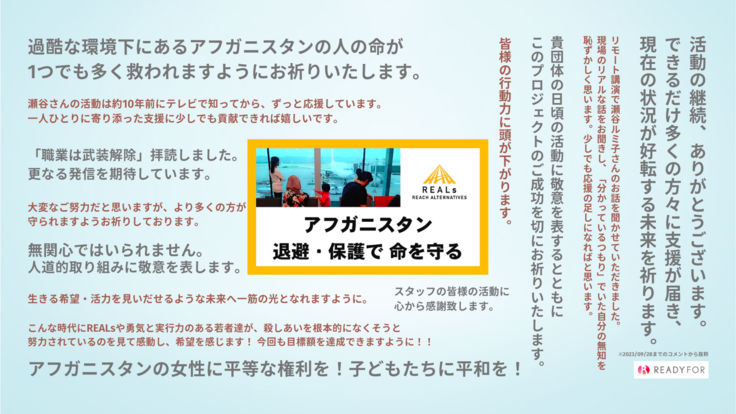 REALsのアフガニスタン退避・保護支援への応援、誠にありがとうございます!