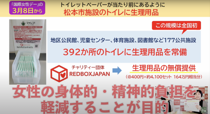 長野県松本市では、女性が抱える生理に伴う精神的・身体的負担軽減と性差にとらわれないジェンダー平等社会の実現のため、トイレットペーパーが当たり前にあるように、必要なときに使えるように2023年3月8日(国際女性デー)より、公共施設内のトイレへの生理用品の設置を決定。レッドボックスジャパンから松本市内 177施設(設置トイレ数 392ヶ所)へ生理用品を提供しました。