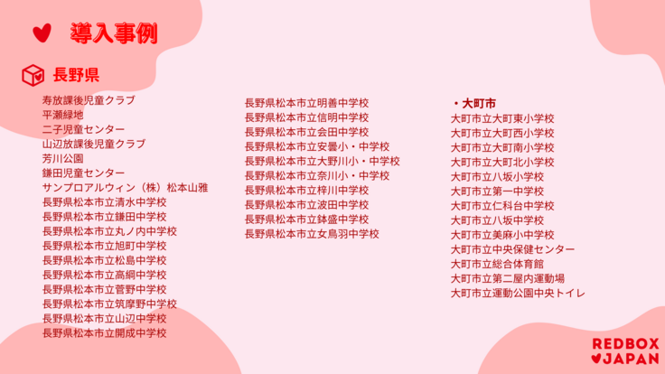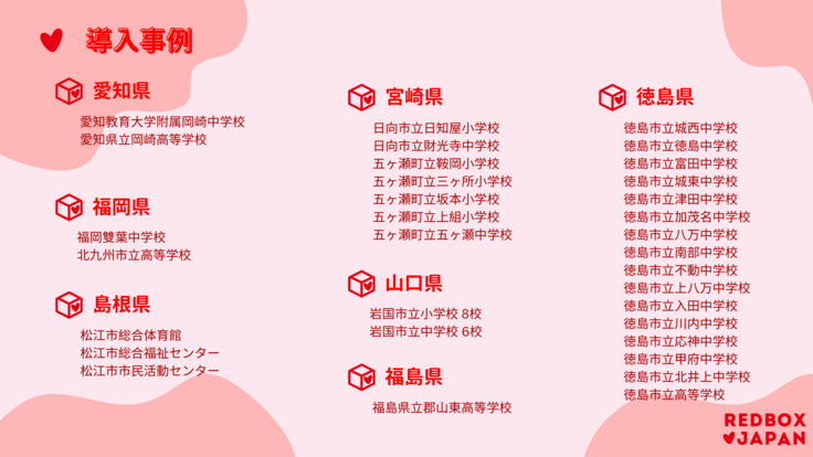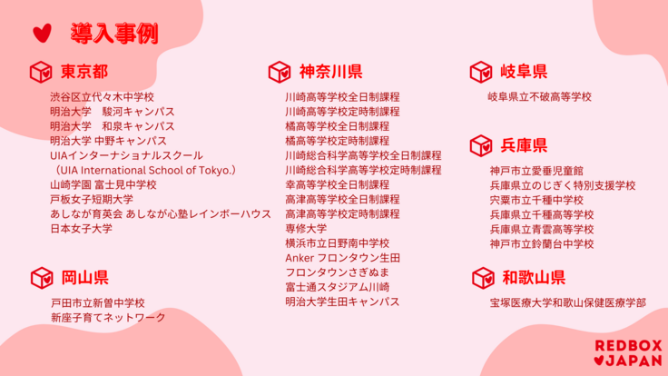 現在、新規設置先として宮城県仙台市の公立小学校・中学校182校へのレッドボックス導入も決定しております。