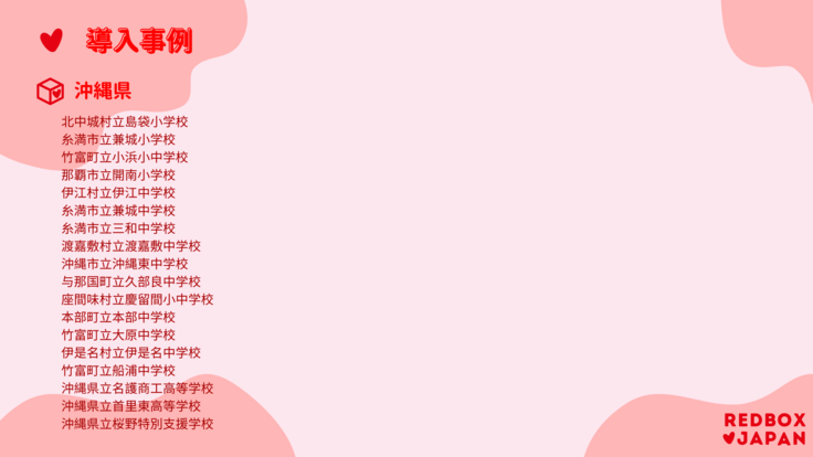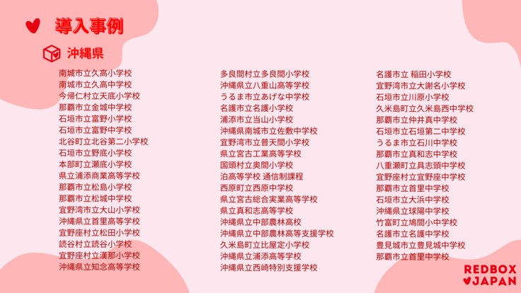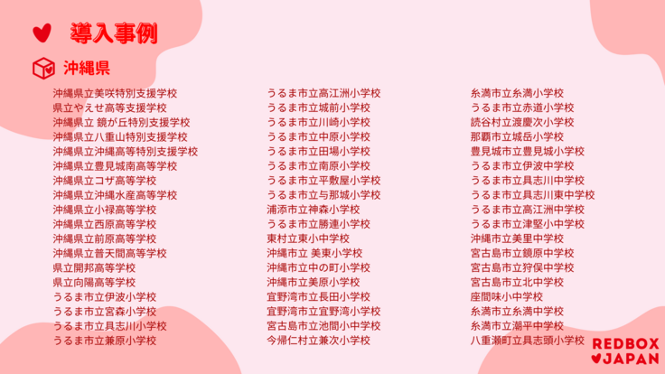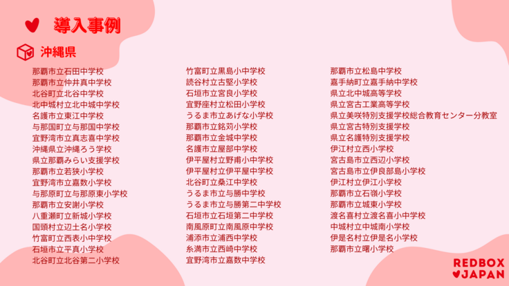 教育委員会と連携し、沖縄県(離島含む)の小学校、中学校、高等学校、特別支援学校 計230校へレッドボックスを設置しています。