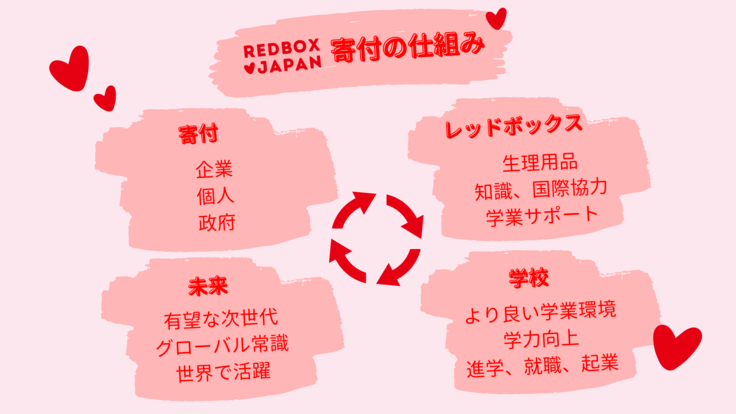 そんな自身の経験から、生理用品の寄付活動を通じて学生の不安に寄り添い、自分たちのからだを理解し、安心して学べる学校環境を支援したいと思い、レッドボックスジャパンを設立しました。