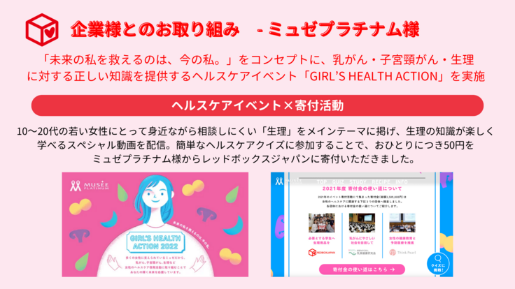 ミュゼプラチナム様が実施したヘルスケアイベント「GIRL’S HEALTH ACTION」では 2021年度、2022年度、2023年度の3年連続の参加。 ヘルスケアイベント寄付活動では、1,000,000円をご寄付いただきました。