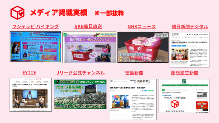 NPO法人レッドボックスジャパンは、赤い箱に生理用品を詰めて学校へ寄付することで、生理期間中の学生が安心して学校に通うことができるようサポートすることを目的としたイギリス発祥のチャリティー団体です。 「生理用品をみんなが使える」を当たり前にする。そして「生理」を通して自分の体のこと、今の世界の課題や考え方を知り、より良い世の中を一緒に考えるきっかけ作りをお手伝いしております。 2019年12月にレッドボックスジャパンを設立。現在までに535の学校・教育機関・公共施設へレッドボックスを寄付しました。(2024年2月時点)