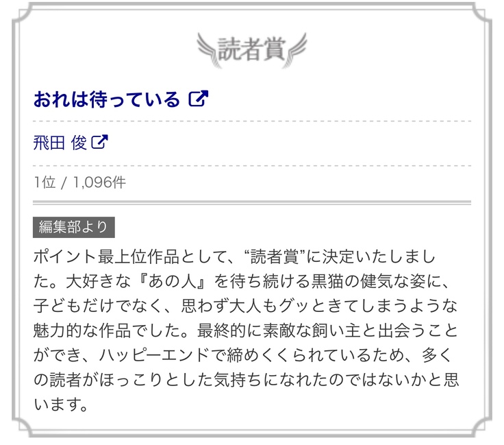 Twitterで奇跡的に広まり、出版社アルファポリス第14回絵本・児童書大賞で投票数1位となり「読者賞」をいただきました。