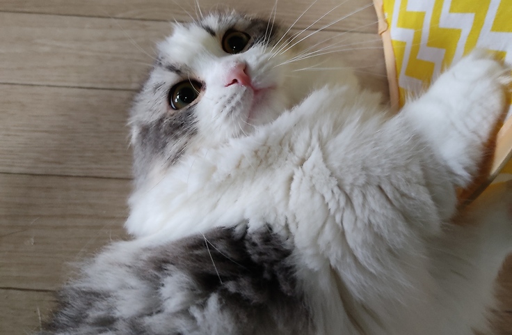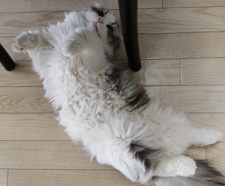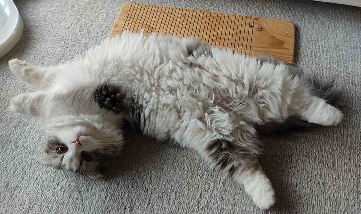 レイくんがゴロゴロする時はほぼ仰向け状態です。向こうに見える洗濯板のようなものは、木製の爪とぎです。ずっとキャットタワーの麻紐のポールで爪とぎしていたのですが、最近ようやくこれを使ってバリバリ爪とぎするようになりました(^^)