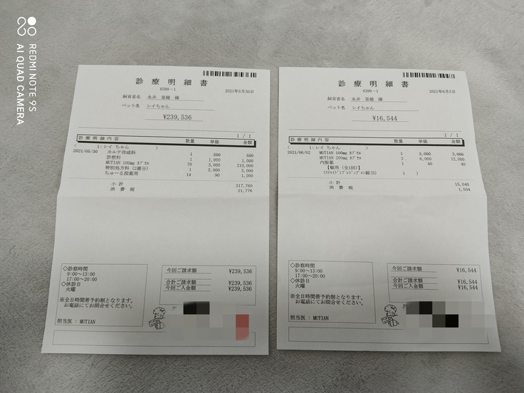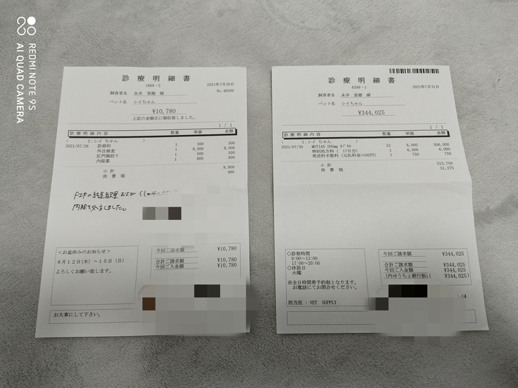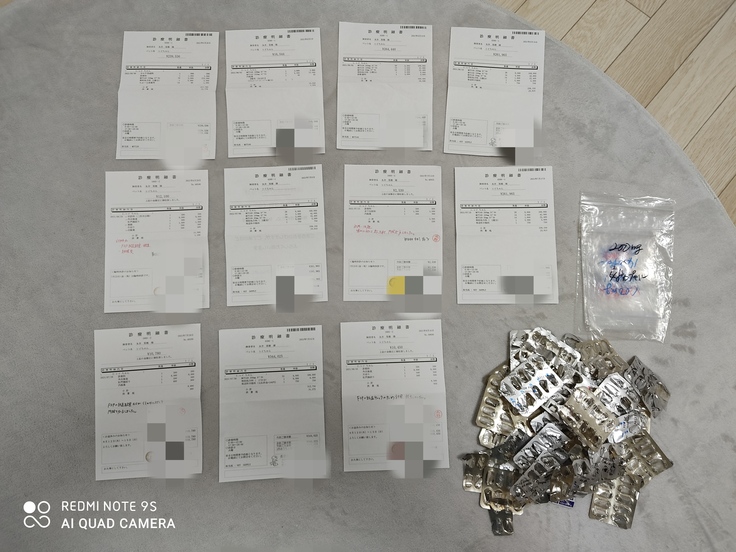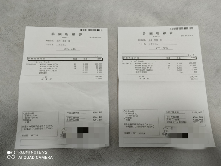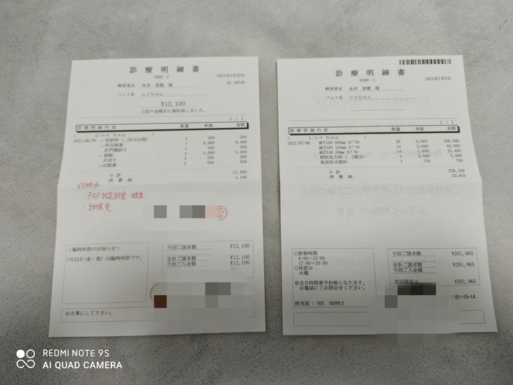 FIPの診断がついてから以降(5/30〜)の新薬の投薬治療を始めてからの領収書全てと飲み切った新薬になります。)
