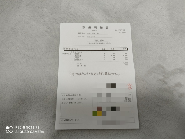 (領収書に記載のある、新薬の発送手数料、薬用チュール、爪切り、肛門絞りは除く)