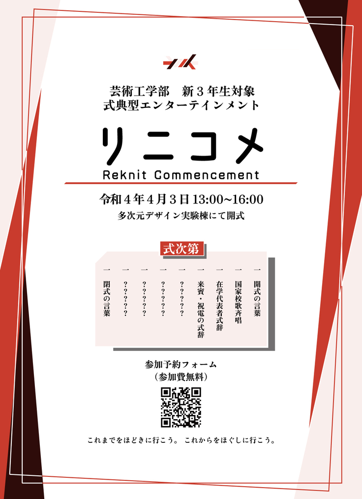 開催時期は2022年4月3日。学部新3年生のこの時期は、学生生活のちょうど真ん中にあたる。振り返るのに良いタイミングとして捉えられるだろう。加えて、時間割に従ってコースの皆で授業を受けて過ごす2年間から、研究室や就職先を意識した道を選び、それぞれの生活にシフトしていく2年間へ変化する。つまりこの時期が、経験においてもターニングポイントだといえるのだ。この二重の節目である時期に、肯定的な心持ちで以て、互いに足並みを揃えたり、人間関係や生活を、整え、編み直す日があるとしたら。それってすごく素敵ではないだろうか。 特に我々2020年入学の世代は、入学式が思うように開催されず、対面授業もなかなかしてもらえなかった。大学生活がぬるっと始まったような、何だか捉えどころの無い春だったような。そんな大学生活に対する不確かさが拭えないのだ。このイベントを機に、そんなもやもやも、取り払ってしまいたい。