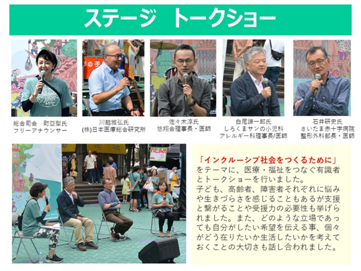 誰も取り残さないインクルーシブな社会が創りたいと思い「ちがうをつなげてみんなのちからに」をテーマに、令和6年9月28日さいたま新都心駅前けやき広場で「インクルーシブフェスタ」を開催しました。当日は1400名を超える皆さまに集まっていただき、子ども、障害者、高齢者を対象とした様々な支援を提供する出展者の皆さまと交流することができました。