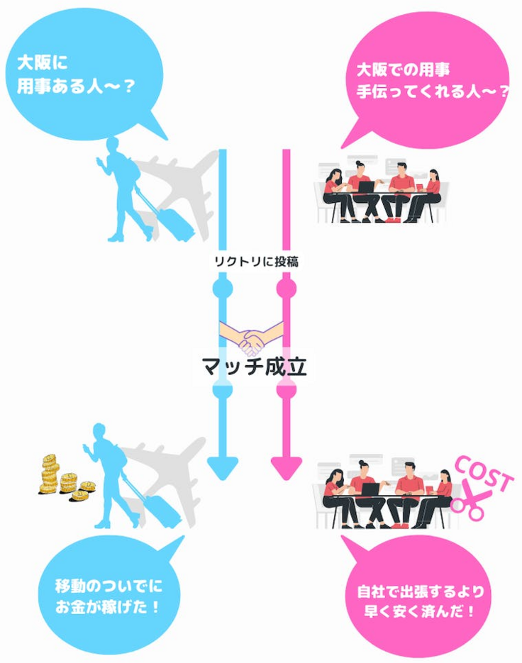リクトリとは、旅行や出張などで移動する人と、離れた場所に用事がある人をつなぐプラットフォームです。