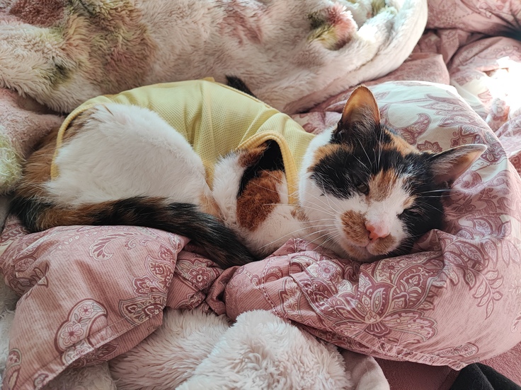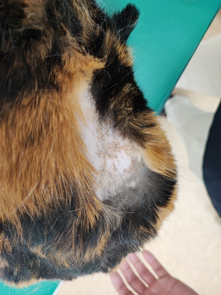 腎瘻チューブを入れていた背中側の毛はカットされています。ここは時間をかけて生えてくるのを待つしか無いです