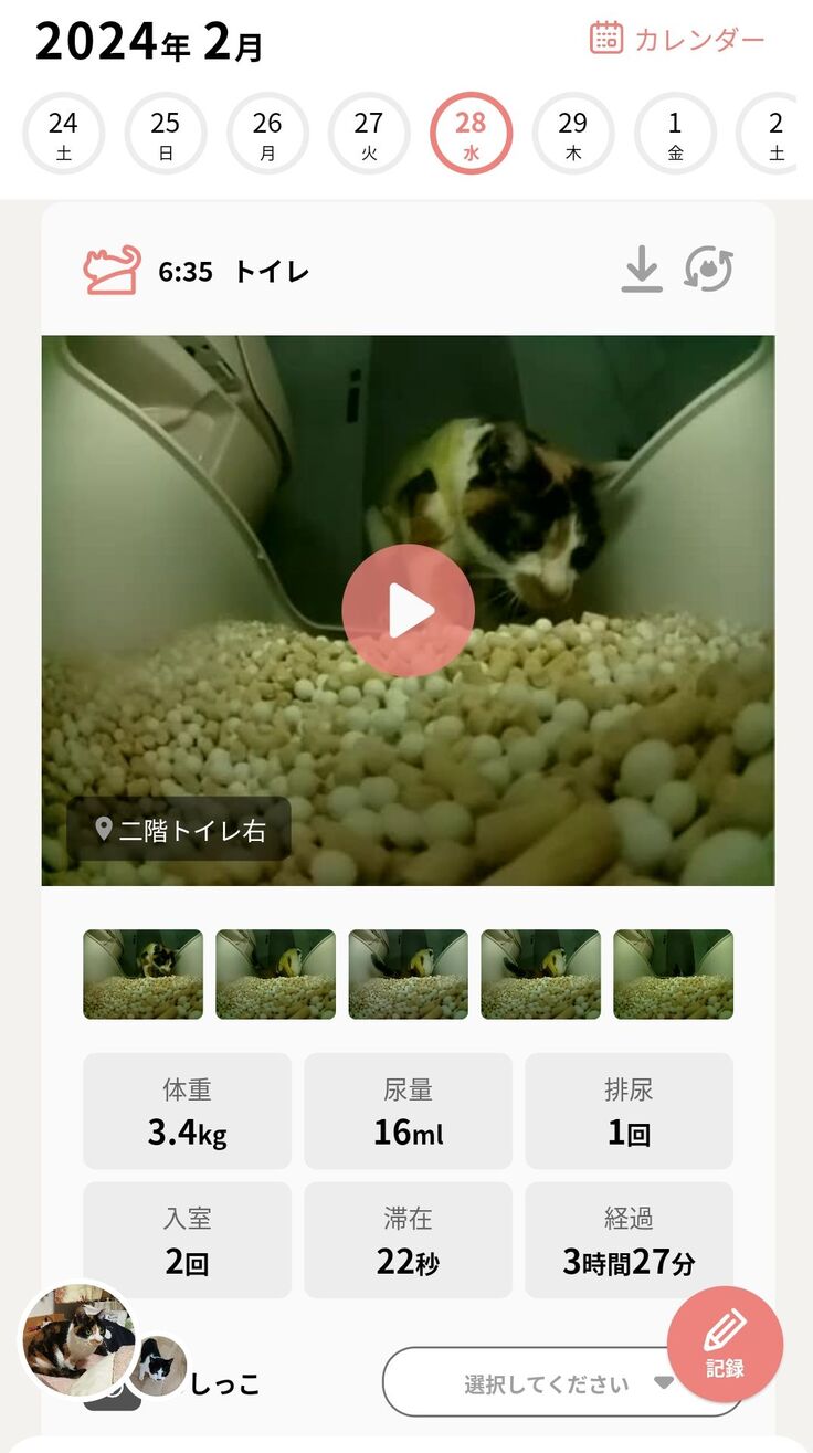 IoT猫トイレtolettaを使っているので、尿の量と体重、尿の回数は自動的に計測をしてくれます。(tolettaの発売された2019年からずっと使用しています)
