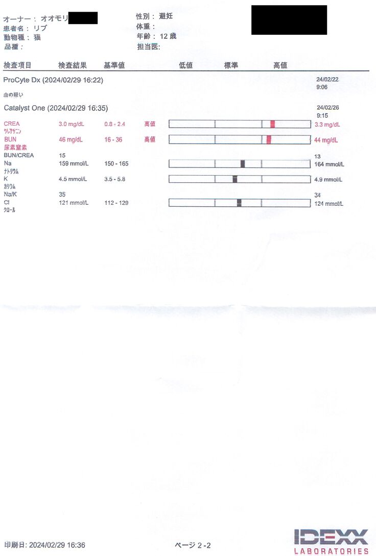 値としては高いですが、二つある腎臓のうち片方だけが機能している状態なので、しょうがないところかなと思っています。(今回その機能していた方が詰まったので本当に致命傷でした…)