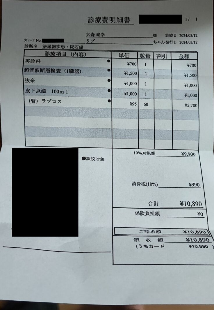 お腹も抜糸もしていただきました。腎臓の薬代もあり、1万円超かかります。