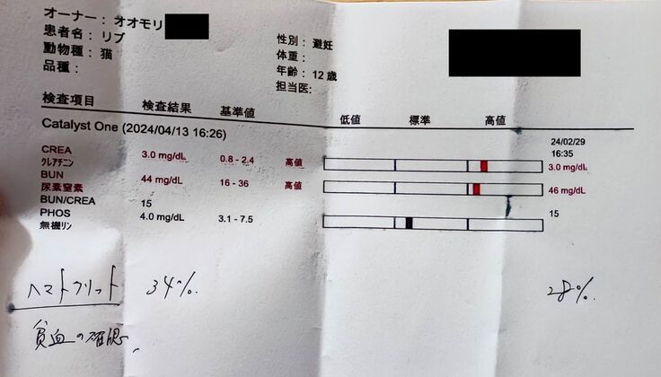 クレアチニンは 3.0mg/dLで、前回2/29(木)(手術して3日後)も3.0mg/dLだったので変わらず