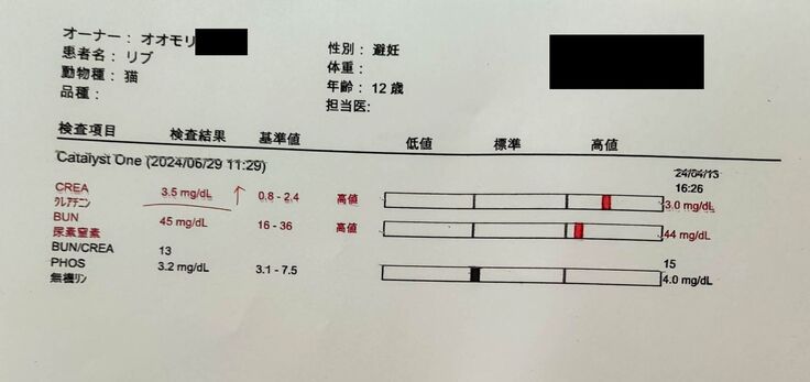 クレアチニンが前回は3.0mg/dL→今回3.5mg/dLと少し上がっていましたが、大きな変動ではないです。BUNも変わらず