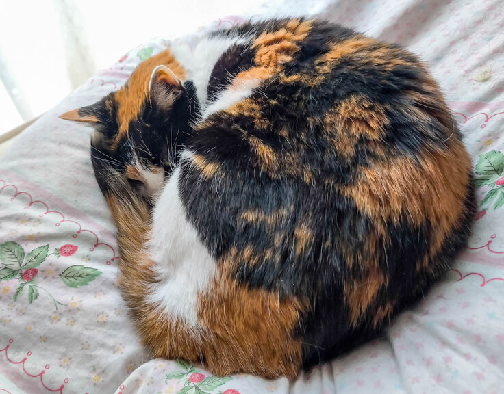 室温は20℃ぐらいありました、リブにとってはちょっと寒いみたいで、布団の上で丸まっています。