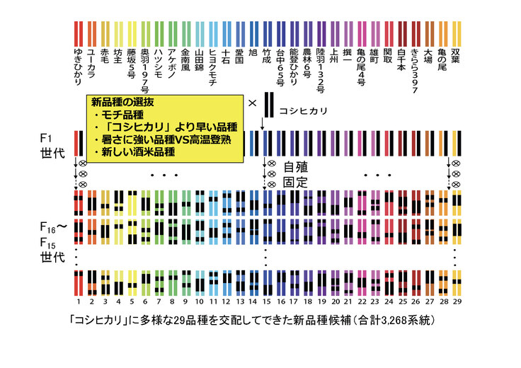 目標としては、モチ品種、「コシヒカリ」より早い品種、暑さに強い品種、新しい酒米品種などが対象になります。