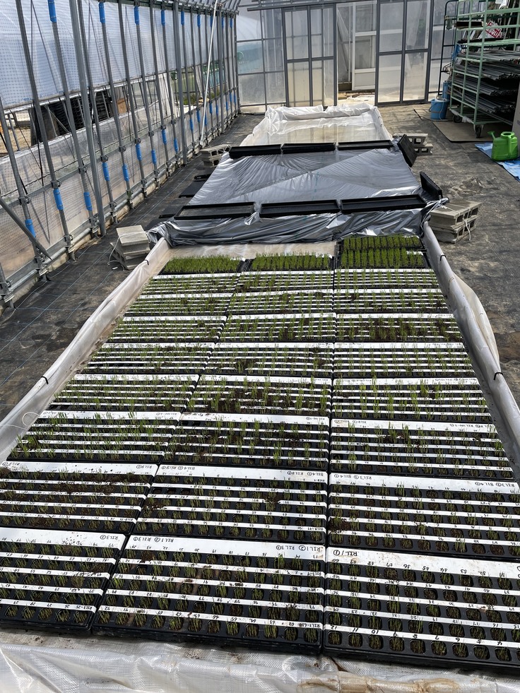みんなで一緒に、苗を運び、覆土をしたり、水やり、テントを張っています。このテントは紫外線を20%程カットするシートで1日間イネを緑化させています。もやしみたいなイネ(サムネイルで私が水やりしている領域、奥の苗が緑が強いのがわかると思います)から、葉緑体を発達させて通常のイネにしています。写真手前が昨日シートで覆って先ほど外したイネになり、奥は今日からシートで覆っています。