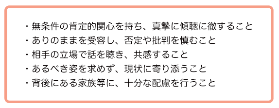 冒頭に書いたように、寄せられる相談は様々ですが、下記に留意してお話を聴かせていただき、依頼者やその家族に寄り添っています。