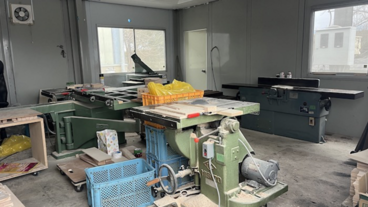 機械屋さんや家具職人さんからろくろや昇降盤、プレーザーを貸していただいたり譲り受けたりし、片付けが進む工場のプレハブの中ながら、体裁が少し整いました。