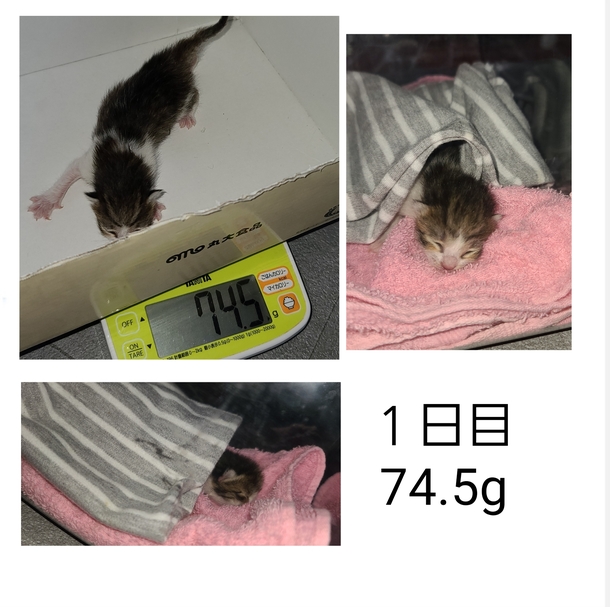 布に包まれて来たのは74.5gの小さな子猫!
