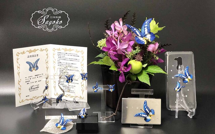 立体刺繡Sayokoの作品集+ヘレナモルフォ蝶のデジタル蝶イヤリング