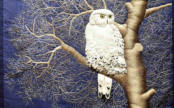 背景の木や枝には6色の糸を使って濃淡をつけ、冬の寒さに耐える大木の幹や、繊細な枝の立体感も表現しました。