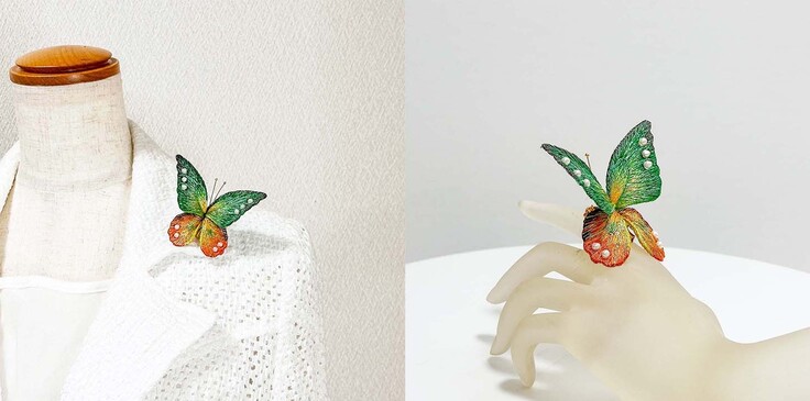 この蝶は、両面立体刺繍という独自の技術により、繊細かつ立体的に命を吹き込まれたアートジュエリーです。