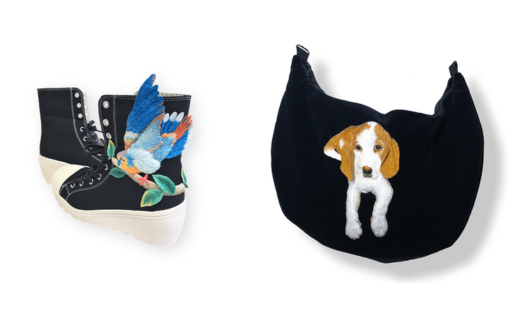 足首をしっかり支えてくれるスニーカーをキャンバスに見立て、両面立体刺繍法で羽を一枚ずつ刺繍。大胆に縫い留め、まるで飛び立つ瞬間をとらえたような靴に仕立てました。