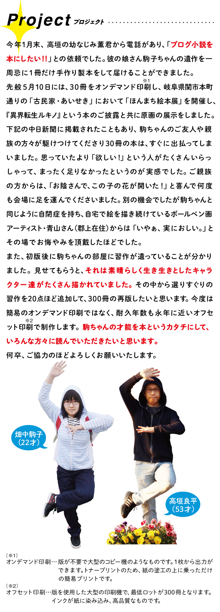 微力ではありますが、駒ちゃんの才能あふれる表現を「本」にし、関わりのある大切な方々に届けたいと考えています。彼女の生きた証が遺るのではないでしょうか。