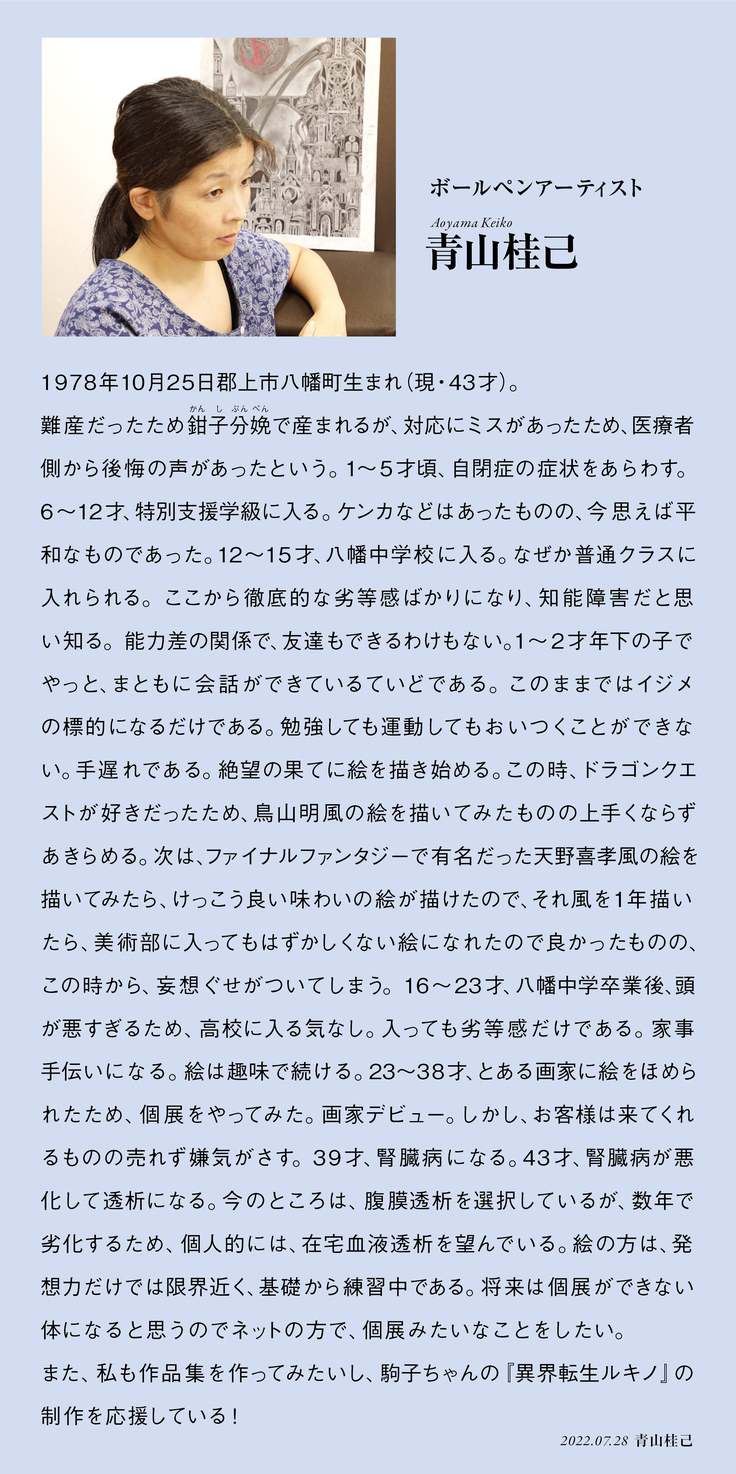 ●自閉症のため、中学卒業後、自宅で絵を描き続けている。現在は「ボールペンアーティスト」として活動中!