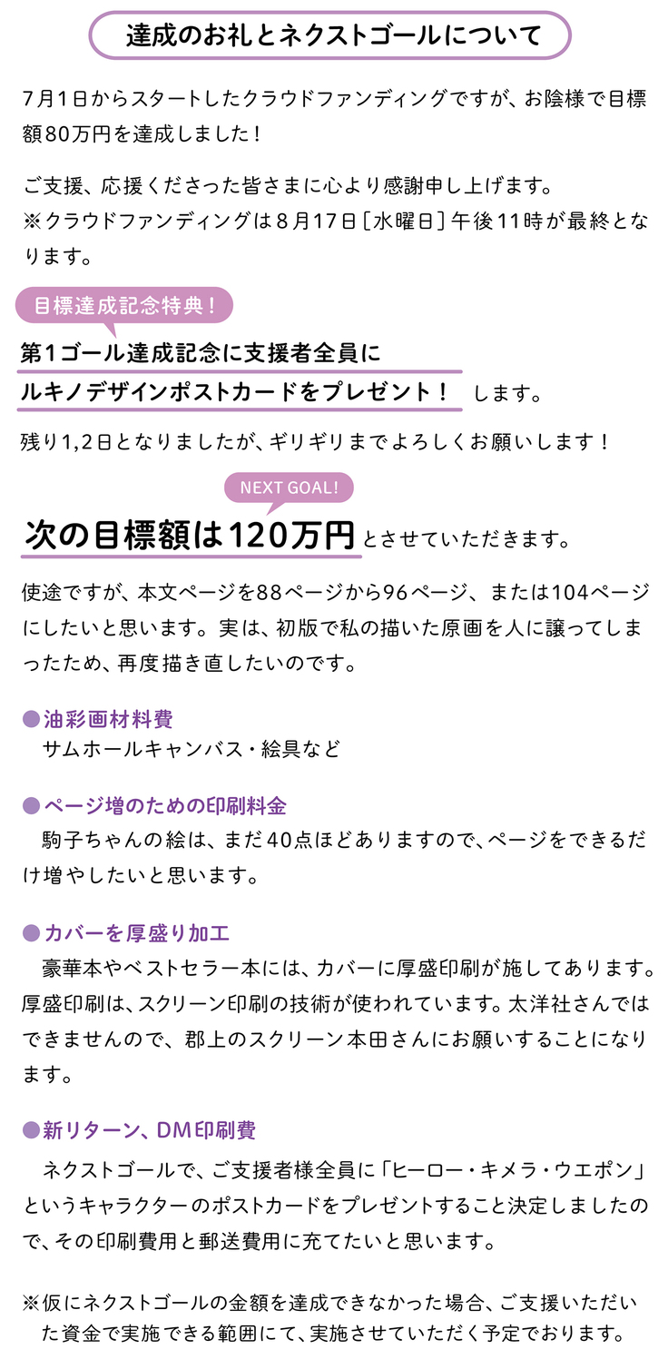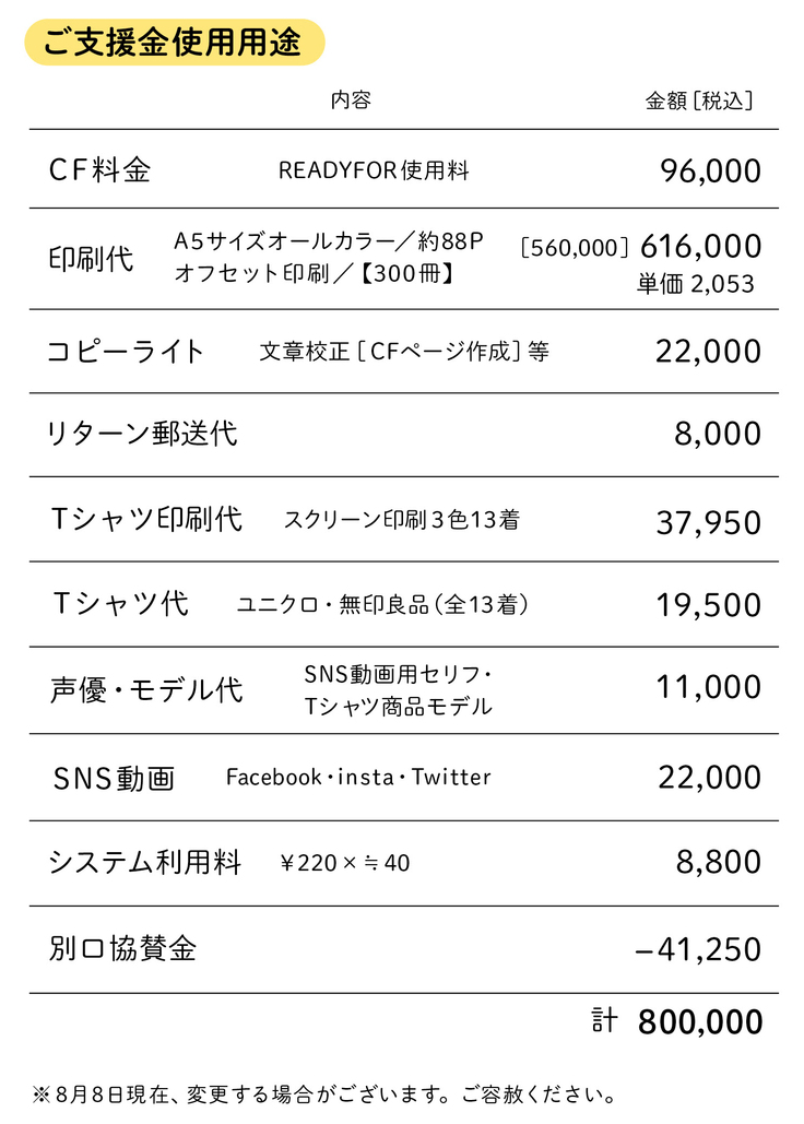 リターンの制作費や郵送料も考慮すると80万円が必要になります。