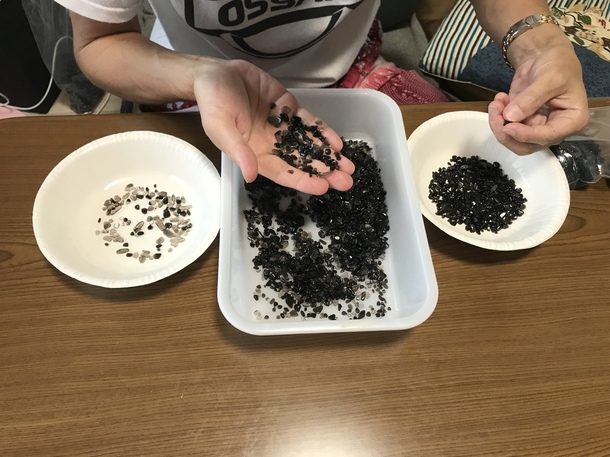 市販の黒水晶さざれ石は透明がかった黒水晶も多く混ざっており、この選別作業をしなければ美しい文字が描けません。