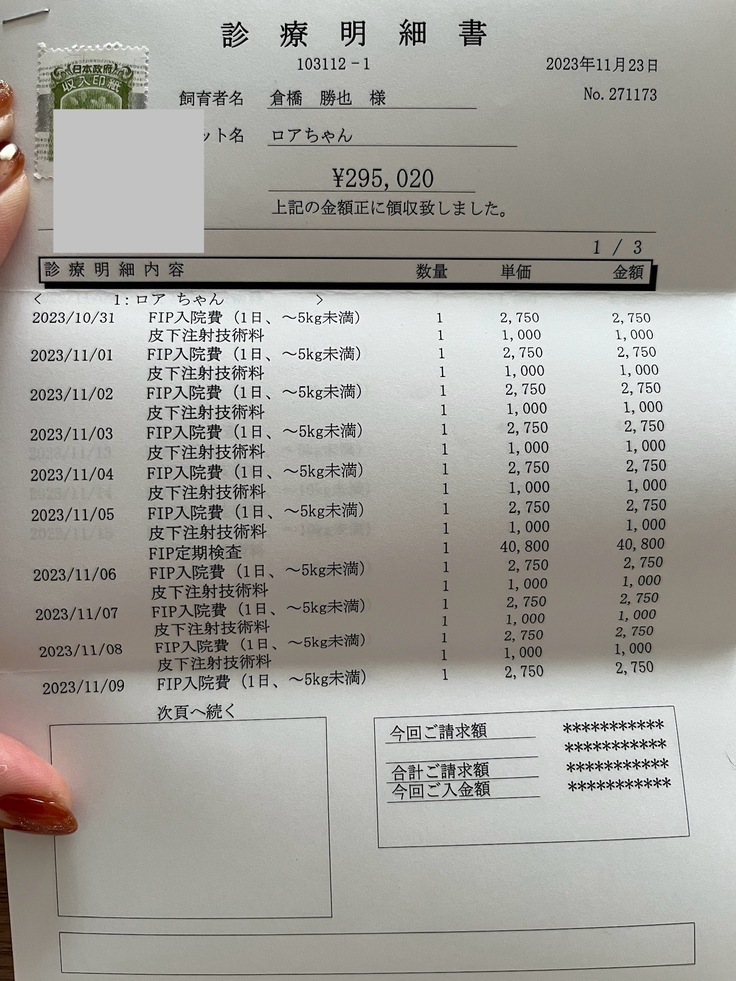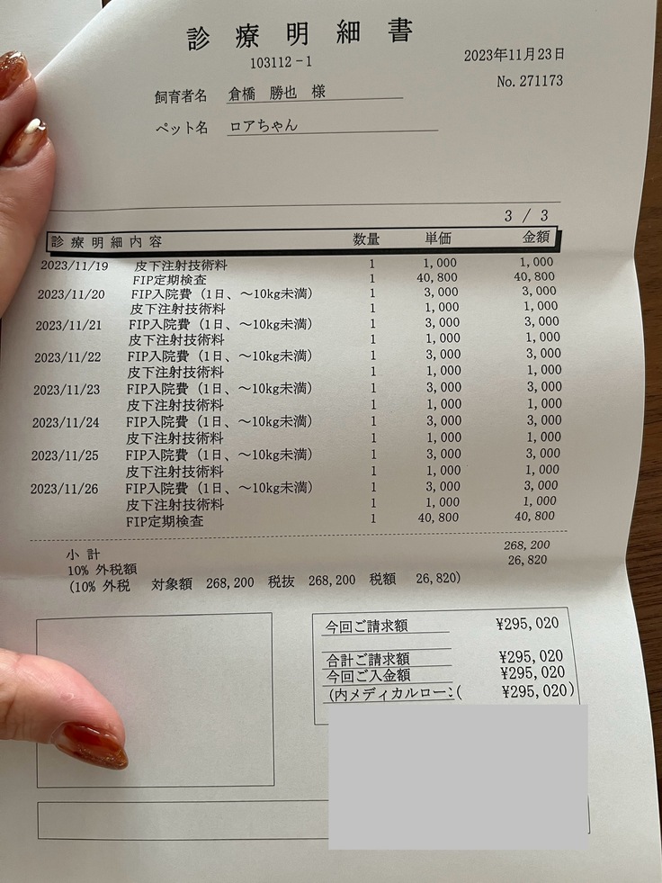 これで、3クールのロアの入院治療費総額は