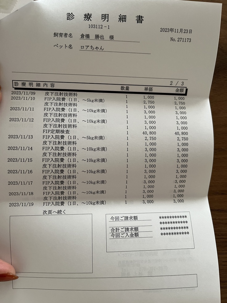 3クール目の入院治療費明細をいただいたので、ご報告いたします。