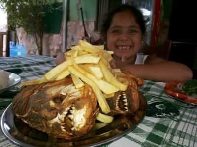 アマゾン地域ではピラニアスープや唐揚げも有名です。ワニの唐揚げもあります。