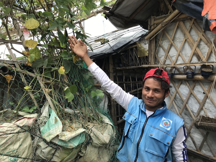 家庭菜園プロジェクトでは、難民キャンプの限られたスペースで野菜を栽培してもらうために、900世帯の女性へ農業技術指導と資材提供を行っています。また、ロヒンギャ難民ボランティア17人を雇用し、OJTを通して養分欠乏・病虫害への対応などを日々サポートしています。