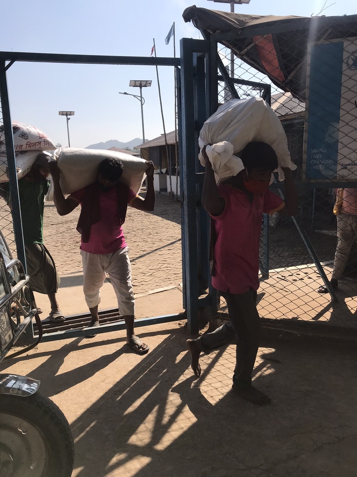 支給する米を各難民の家へ運ぶポーターのひとたち、かなりの力仕事