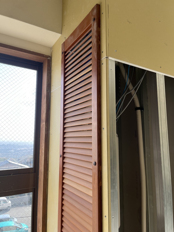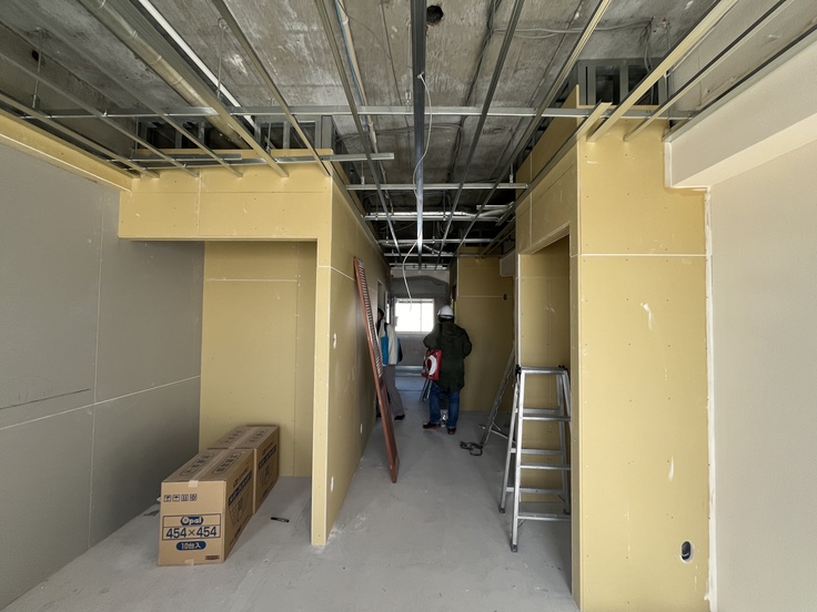 工事現場の写真を撮ってまいりましたので、こちらで紹介いたします。現在は水回りも含め、もう少し工事が進んでおりますが、壁や天井がつき、お部屋っぽくなりました。