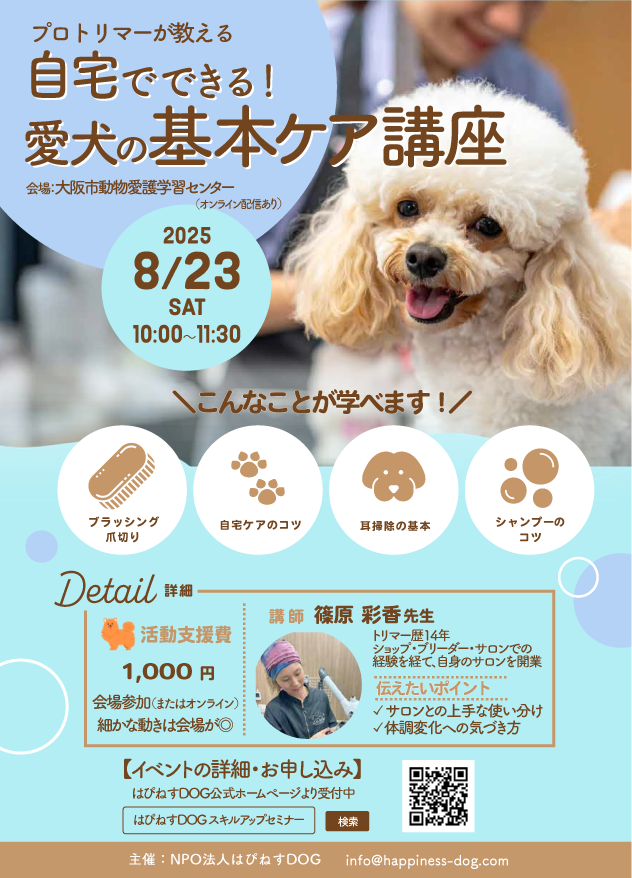 今回は、トリマー歴14年のベテラン講師・篠原彩香先生をお迎えし、会場で実演しながら学べる特別講座です。