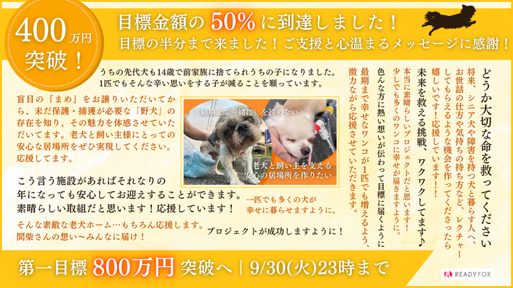 おかげさまで、第一目標800万円の50%となる400万円まで到達いたしました!
