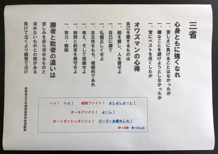本校のボート部には「三省」という50年近く受け継がれてきた心得があります。私たちはこの三省を大会の度に復唱し自分自身に言い聞かせるとともに、仲間との結束を高めています。(ちなみにOB・OGは卒業して数十年たっていても三省を覚えているそうです。)